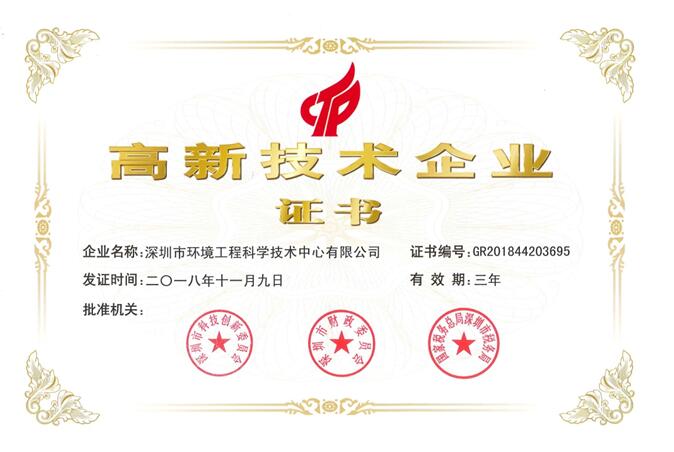 面朝大海,春暖花開。新春伊始,深圳市環(huán)境工程科學(xué)技術(shù)中心有限公司傳來喜訊:公司榮獲“國家高新技術(shù)企業(yè)”證書(證書號:GR201844203695)。