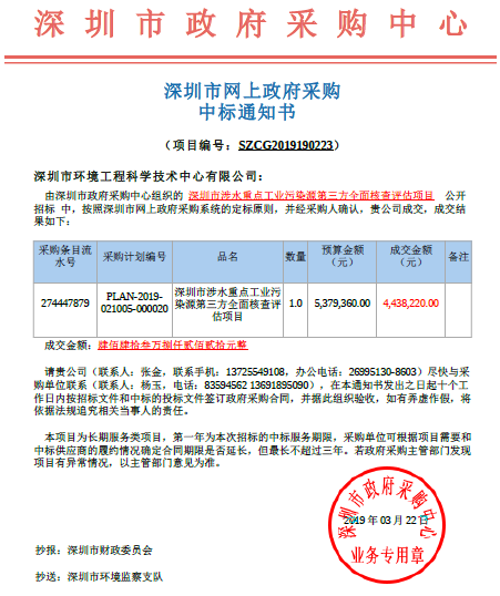2019年3月4日,深圳市環(huán)境監(jiān)察支隊委托深圳市政府采購中心對深圳市涉水重點工業(yè)污染源第三方全面核查評估項目進行公開招標。我公司積極組織人員,各部門人員鼎力合作,高效、高質(zhì)地完成了投標工作,于2019年3月19日一舉中標,中標價443.822萬元。