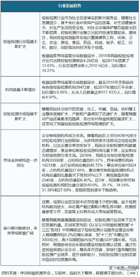五、發(fā)展前景目前檢驗檢測行業(yè)已列入國家戰(zhàn)略性新興產(chǎn)業(yè)名錄。隨著我國經(jīng)濟的發(fā)展,建筑、食品、環(huán)保、機動車等領(lǐng)域發(fā)展迅速,對檢驗檢測的需求擴大,我國檢驗檢測行業(yè)得到了快速發(fā)展,行業(yè)規(guī)模不斷擴大,在國家政策的要求下,未來我國檢驗檢測行業(yè)將向更加規(guī)范的方向穩(wěn)步發(fā)展。